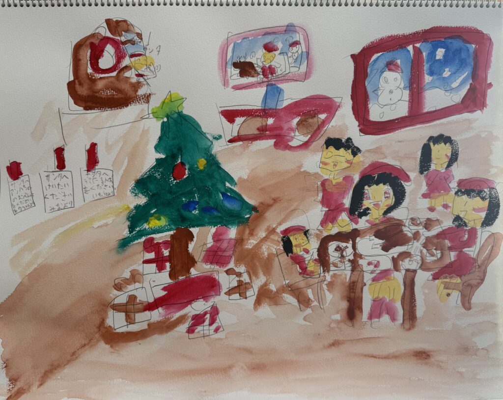室内の様子がよく描けていますね!細かい設定もバッチリ♪サンタさんがテレビ画面と窓からニコニコです。幸せな時間が伝わってきます♪いい〜!!