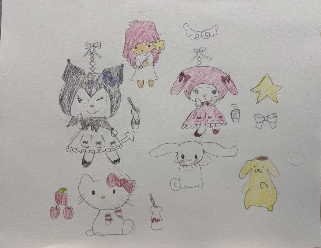 Mちゃん♪ クロミとマイメロの可愛らしい頭巾やお洋服も上手に模写♪ポーズや小物が複雑なんです!大人でもクロミちゃんの模写大変なんですよ〜難しいキャラクターを頑張りました♪