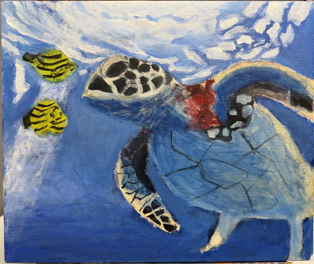 Tちゃん♪アクリル画の完成です。夏から進め、11月ごろに完成しました。諦めず、飽きず、大変よく頑張りました!!海面から差し込む光がいい感じ♪海亀の体の陰もいいですね!のんびり漂っている様子が伝わります♪