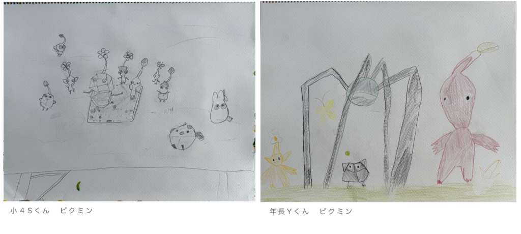 Yくん♪敵キャラを大きく伸び伸び入れて〜多面体の岩ピクミンも上手に描いています♪楽しく描いたのが伝わりますね!