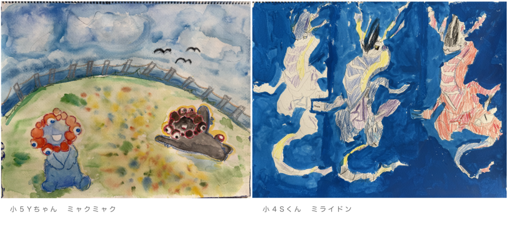 Yちゃん♪透明水彩とクレヨンでほんわか世界いいですね!Yちゃんの想像世界にミャクミャクを引き込んで!!大変素晴らしいです〜!!
