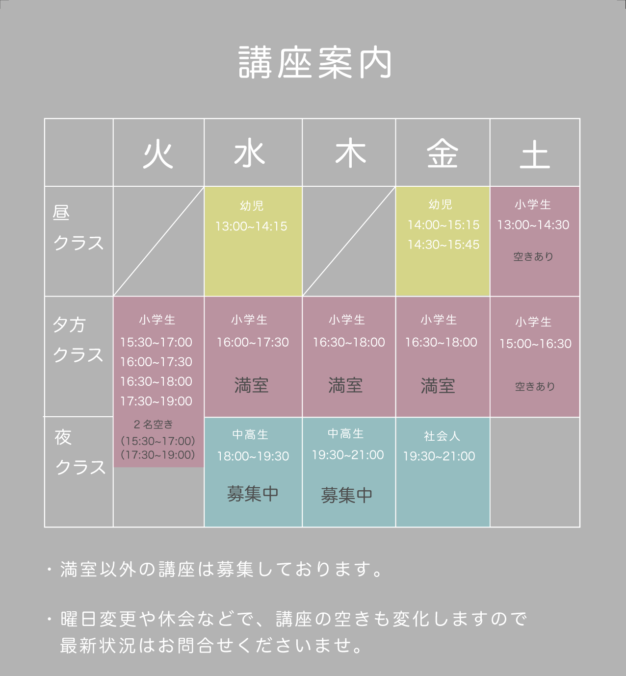 平日小学生空きは火曜2名(15:30~17:00)or(17:30~19:00)